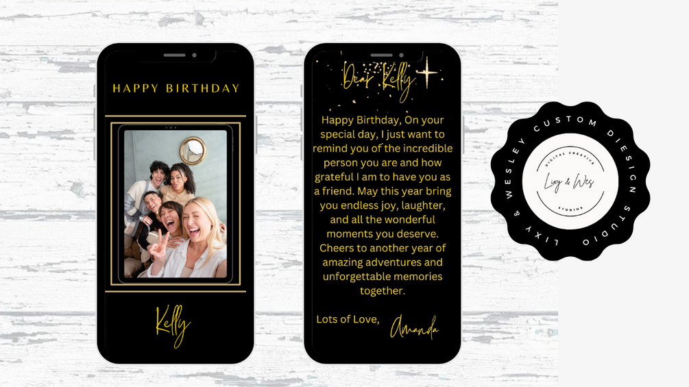 Send a stunning, elegant birthday wish that shines as brightly as the occasion! This sophisticated digital birthday card blends modern design with a premium golden night aesthetic, making it the perfect personalized gift. Easily customize text, colors, and photos in FREE Canva—no subscription needed!